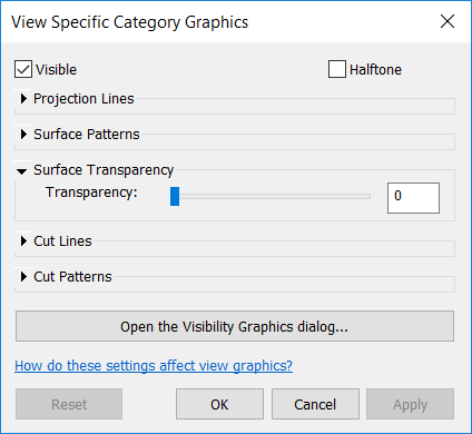 - In the View-Specific Category Graphics dialog, change the settings as desired.