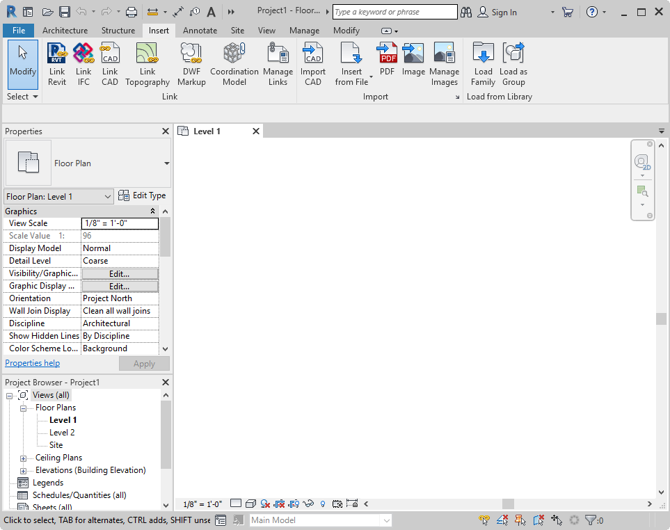 The drawing area displays views (and sheets and schedules) of the current model. Each time you open a view in a model, the view displays in the drawing area.
