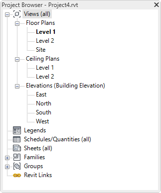 The Project Browser shows a logical hierarchy for all views, schedules, sheets, groups, and other parts of the current project. As you expand and collapse each branch, lower-level items display.