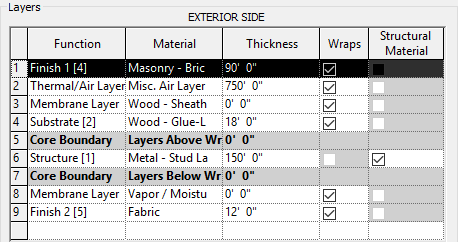 The position, thickness, and material for each layer and region are defined through the type properties of the wall, using the Edit Assembly dialog.