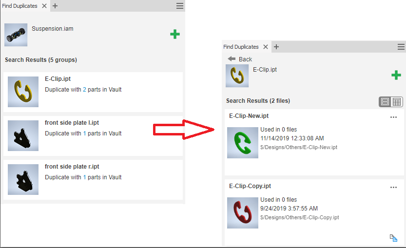Click a desired group result to view individual duplicate parts.