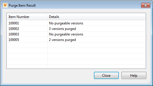 After you Purge Items with the Vault Client, the Purge Item Result dialog displays. This dialog shows the item numbers for all items that were selected for purge, and the number of versions of each item that were successfully purged.
