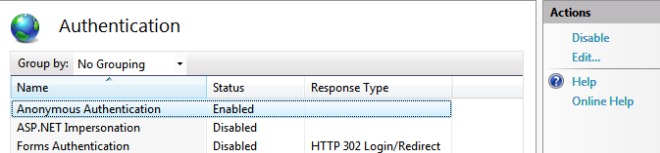 - Click Anonymous Authentication and make sure it is enabled.