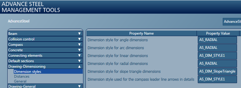 - In the Management Tools application, a specific set of defaults are configured to link Advance Steel to those dedicated dimension styles.