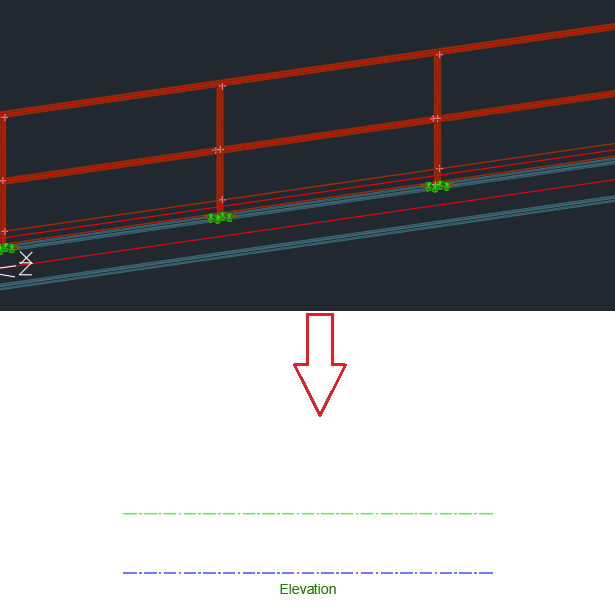 Using this workflow it is possible to plot two beams detailed as visible, but with different structural roles and with two different line types. This configuration does not apply to the DWG file (where the difference is only the used color). The configuration applies when sending to any type of plotting (PDF, paper), the CTB file will control the line type.