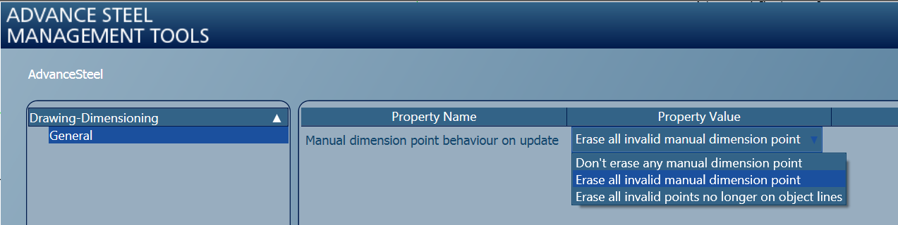 By default it is set on Erase all invalid dimension point - This setting is best used if all the dimensions are created matching the requirements of smart dimensions. This setting will ensure that all the dimensions are created between valid points, that can update, and that during update, the dimensions values are correct and according to the model.