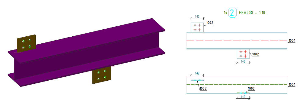 This option creates separate dimension chains for each individual object (the object can be a feature, such as a cut or a cope or it can be an attached beam or plate) on the drawing. Use this option to also automatically arrange the dimensions on the corresponding side of the targeted objects.