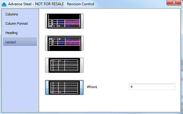 Places the heading at the top side of the revision table. Additionally, the number of rows can be specified. |