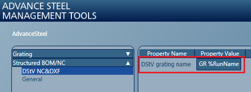 The name of a grating, as it appears in Advance Properties, can be displayed in DStV BOM lists.