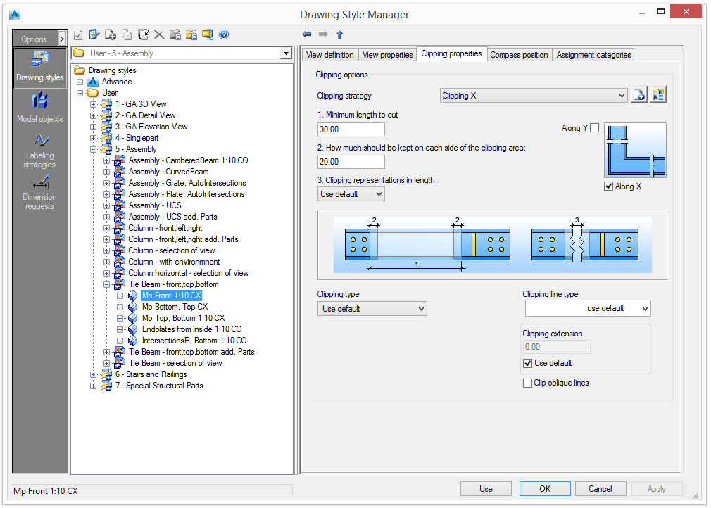 Optionally, the clipping can be represented with extension lines (clipping line oversteps the element). The line extension size can be set.