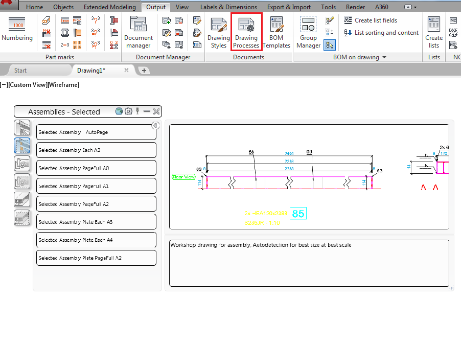Alternatively, you can access the drawing processes using the Drawing Processes Palette, in the Output tab
