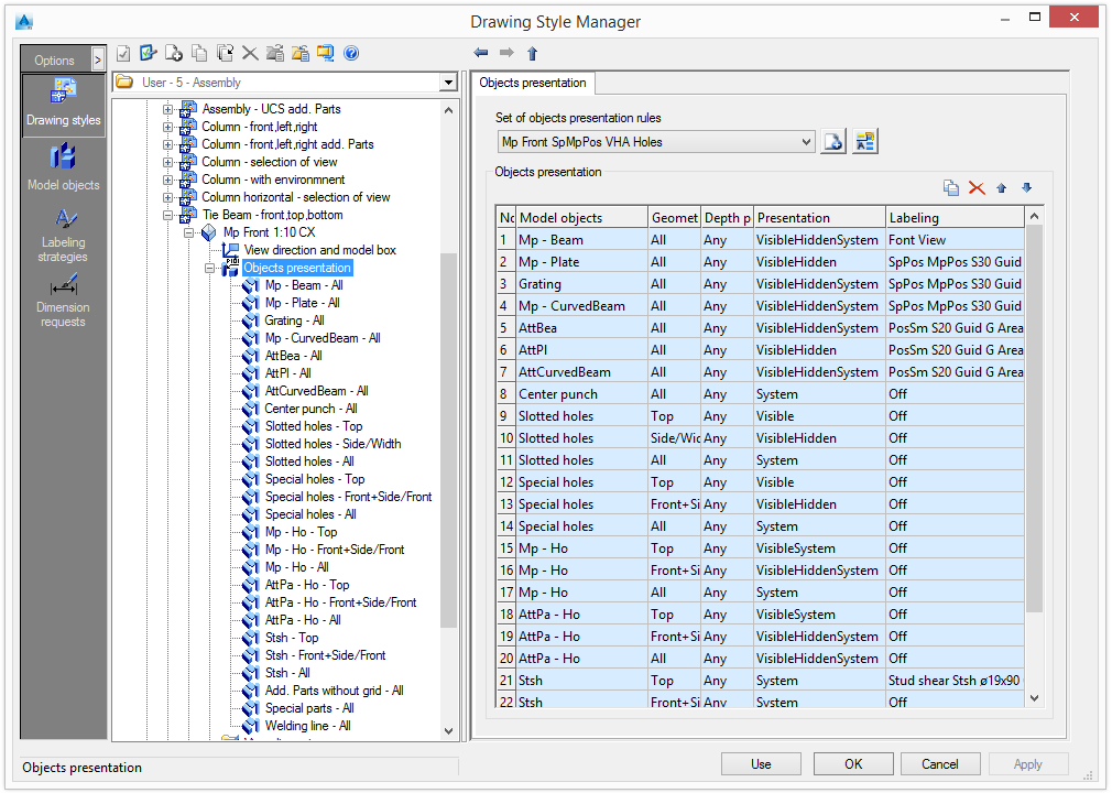 The presentation rule contains settings for color and line type used for each object representation in the detail.