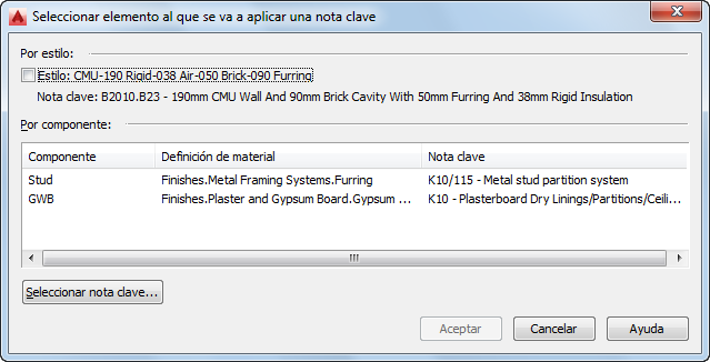 una o más notas clave ya están asociadas con el estilo de objeto o con las definiciones de material de los componentes del objeto seleccionado | aparece el cuadro de diálogo Seleccionar elemento al que se va a aplicar una nota clave.