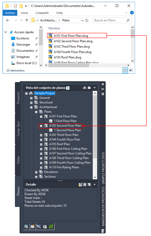 - Coloque la carpeta en el explorador de dibujos de la ficha seleccionada del Navegador de proyectos: