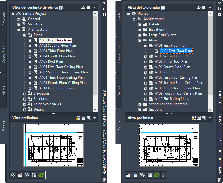 Ficha Planos con la Vista del conjunto de planos del proyecto (izquierda) y la Vista del Explorador (derecha)