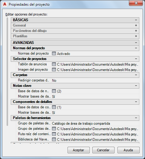 Puede definir o modificar las propiedades avanzadas del proyecto, como las normas, las imágenes, las notas clave, los componentes de detalle y las paletas de herramientas.