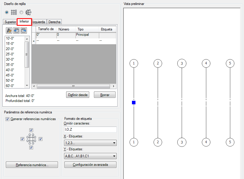 De este modo, el primer hueco se extiende dos huecos hacia la parte inferior, obteniendo cuatro líneas de rejilla, en lugar de cinco. Ahora puede pasar a la ficha Izquierda para editar el otro eje de la rejilla o bien pulsar Intro para colocar la rejilla en el dibujo.
