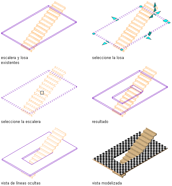 Utilice este procedimiento para crear un área de interferencia de escaleras en losas. Si incorpora una condición de interferencia entre una escalera y una losa, en la escalera se corta un cuadro, basado en la altura de espacio especificada y en los espacios libres laterales izquierdos y derechos de escaleras rectas y con varios descansillos, o en los espacios libres internos y externos de escaleras en espiral y en forma de U.