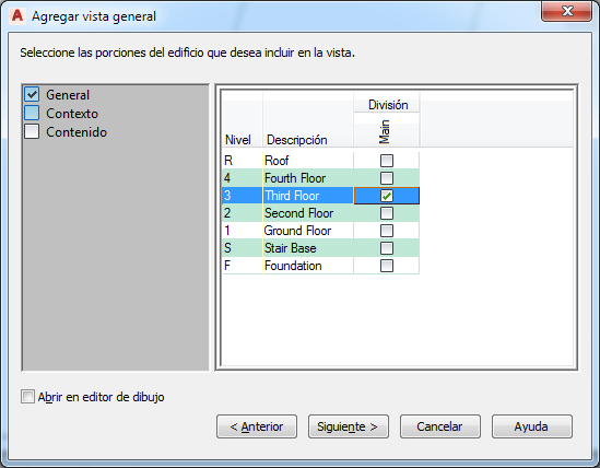 Siga este procedimiento para seleccionar partes del edificio para incluir en la vista mediante la asignación de niveles y divisiones. Es posible seleccionar varios niveles y divisiones para un dibujo de vista, por ejemplo, para generar una vista de todo el edificio. Se facilita el contexto para el dibujo de vista.