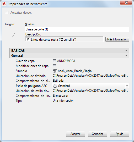 Estilo de polígono AEC | Especifica si la marca de interrupción tiene propiedades de máscara. Si esta propiedad no está definida (--), se usa el estilo predeterminado estándar. |