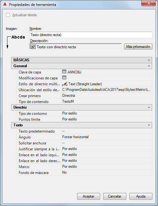Directrices/Ubicación de estilo de cota de directriz | Indica la ubicación del estilo de cota si es diferente del estilo de cota del dibujo. Seleccione la propiedad y, con la opción Examinar de la lista desplegable, busque y escriba la ruta de acceso al estilo seleccionado. Si no se especifica esta propiedad (--), se emplean los estilos del dibujo. |