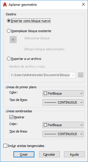 Precisa que la representación aplanada se inserte como un bloque en el dibujo actual.