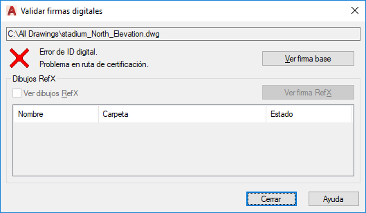 Contiene una lista de los dibujos de referencia externa en un archivo firmado. Esta lista sólo está disponible si el archivo actual contiene alguna refx y se ha seleccionado Ver dibujos RefX.