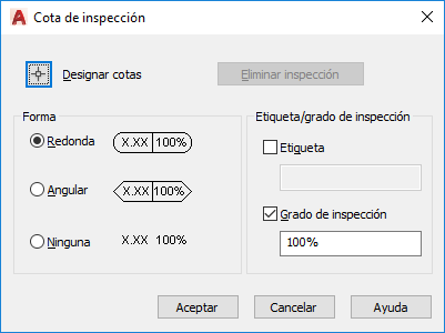 Especifica el texto de la etiqueta y el grado de inspección de una cota de inspección.