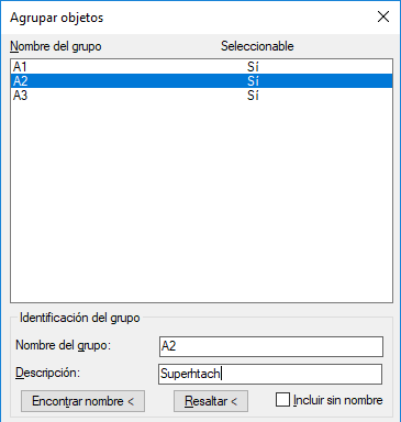 3) Seleccione el grupo. Observe que "superhatch" aparece en el campo de descripción de los grupos creados por SUPERHATCH.