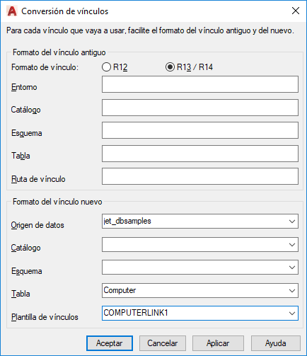 En Catálogo, escriba el nombre del catálogo R13 o R14 para el vínculo que desea convertir.