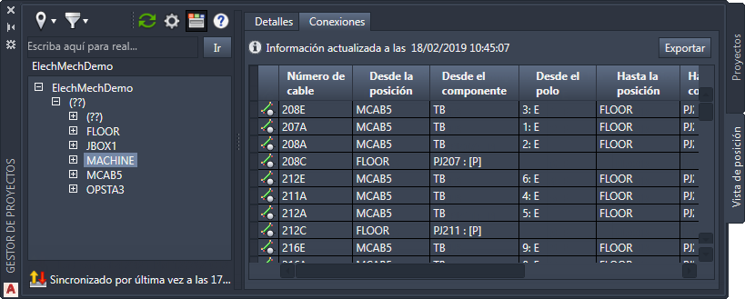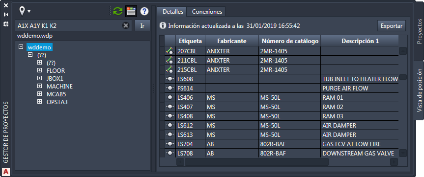 Seleccione la ficha Vista de posición. Seleccione el nodo o dispositivo del árbol cuyos detalles o conexiones desea ver. Seleccione el nodo superior para ver el proyecto completo. Haga clic en .