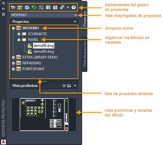 Gestor de proyectos es una paleta que puede permanecer en pantalla incluso mientras se utilizan otros comandos. Se puede acoplar, cambiar de tamaño y ocultar automáticamente.