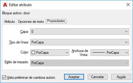Define la capa en la que se encuentra el atributo, así como el color, el grosor de línea y el tipo de línea del atributo. En el caso de que el dibujo utilice estilos de trazado, podrá asignarle uno al atributo mediante la ficha Propiedades.