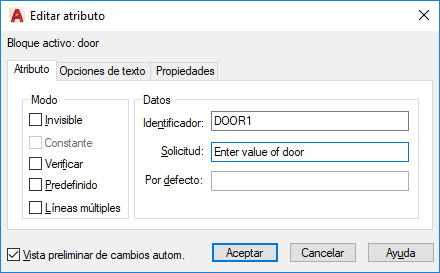 Activa y desactiva la asignación del valor por defecto. Si esta opción está seleccionada, se asignará al atributo su valor por defecto al insertar el bloque. Si se deja sin marcar, se ignora el valor por defecto del atributo y se solicita al usuario que escriba un valor al insertar el bloque.