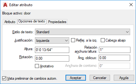 Controla si se debe actualizar el área de dibujo inmediatamente para que se muestren los cambios de atributo visibles que se hayan realizado. Si la casilla Vista preliminar de cambios autom. está marcada, los cambios se aplicarán acto seguido. En el caso contrario, éstos no podrán verse inmediatamente.