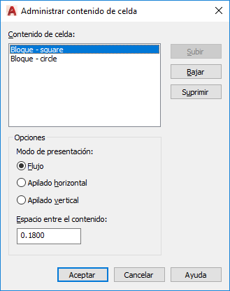 Muestra todos los textos o bloques de la celda seleccionada por orden de aparición. El texto se indica con la etiqueta Texto de celda de tabla. Los bloques se marcan con Bloque delante del nombre del bloque.