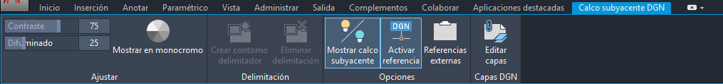 Al seleccionar un calco subyacente DGN en un dibujo, la ficha contextual Calco subyacente DGN aparece en la cinta de opciones.