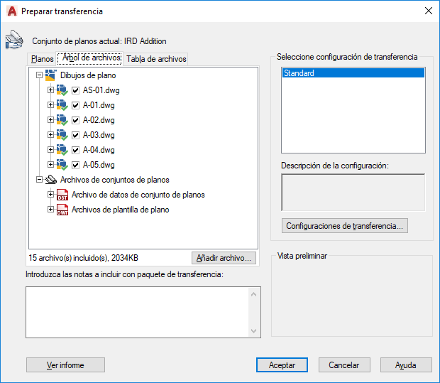 Por defecto, todos los archivos que estén asociados al dibujo actual (como referencias externas relacionadas, estilos de trazado y fuentes) aparecen en la lista. Se pueden añadir archivos al paquete de transferencia o eliminar los ya existentes. Los archivos relacionados a los que se hace referencia desde direcciones URL no se incluyen en el paquete de transferencia.