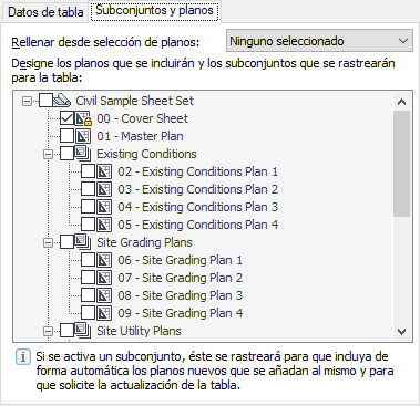 Ficha Subconjuntos y planos (cuadro de diálogo Tabla de lista de planos)