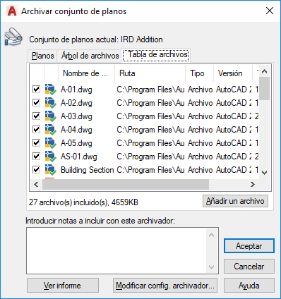 Muestra una lista de los archivos que se deben incluir en el paquete de archivado en formato de tabla. Por defecto, todos los archivos que estén asociados al dibujo actual (como referencias externas relacionadas, estilos de trazado y fuentes) aparecen en la lista. Se pueden añadir archivos al paquete de archivado o eliminar los ya existentes. Los archivos relacionados a los que se hace referencia desde direcciones URL no se incluirán en el paquete de archivado.