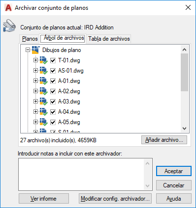 Muestra una lista de los archivos que se van a incluir en el paquete de archivado en formato de árbol jerárquico. Por defecto, todos los archivos que estén asociados al dibujo actual (como referencias externas relacionadas, estilos de trazado y fuentes) aparecen en la lista. Se pueden añadir archivos al paquete de archivado o eliminar los ya existentes. Los archivos relacionados a los que se hace referencia desde direcciones URL no se incluirán en el paquete de archivado.