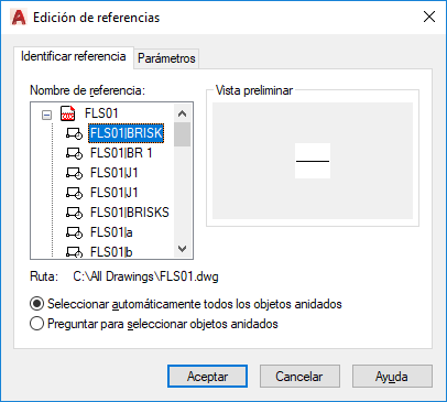 Para seleccionar la referencia que desea editar, designe un objeto de la referencia. Si designa un objeto que forma parte de una o más referencias anidadas, dichas referencias anidadas aparecerán en el cuadro de diálogo.