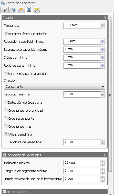 Para las operaciones de acabado, el valor por defecto es 0 mm (0 pulg.), es decir, no se deja material.