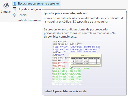 Procesamiento posterior es el proceso por el que se convierte la imagen de la ruta de herramienta que aparece en pantalla al idioma de una máquina CN específica. La salida se obtiene generalmente en forma de código G, un formato alfanumérico utilizado para controlar la herramienta de maquinaria. Diferentes máquinas utilizarán variaciones de este formato de código G para sus controles. Por lo tanto, si bien existe una cierta estandarización en el código, no todas las máquinas utilizan el mismo formato idéntico de código G. Por ello, Fusion dispone de una gran variedad de posprocesadores. Considere el posprocesador como un traductor de idiomas.