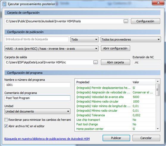 Después de seleccionar el posprocesador, pulse el botón Publicar situado en la parte inferior de la página. Si la opción "Abrir archivo NC en el editor" está activada, se abrirá el editor por defecto y se mostrará la salida de NC.