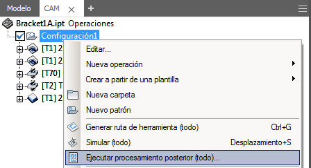 Puede procesar posteriormente para cualquier ruta de herramienta individual o cualquier combinación de rutas de herramienta. Para seleccionar todas las rutas de herramienta, haga clic en Configuración en el Explorador. Después de seleccionar las rutas de herramienta, puede hacer clic con el botón derecho en las operaciones y seleccionar Ejecutar procesamiento posterior. También puede acceder a esa opción desplegando el panel Acciones.