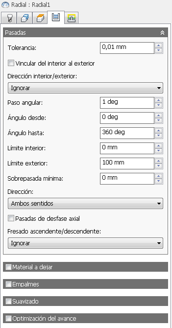 Las pasadas pueden estar vinculadas en un patrón en zigzag entre el radio exterior e interior, de adentro hacia fuera o de afuera hacia dentro; o se pueden dividir automáticamente para dar como resultado pasadas de fresado ascendentes o descendentes.
