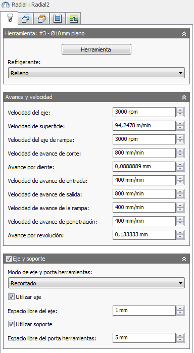 Si se cambia el material radial a dejar, el material axial a dejar se define automáticamente en la misma cantidad, a menos que se introduzca manualmente el valor de material axial a dejar.