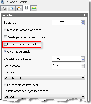 Una operación Paralela generalmente produce rutas de herramienta de alta calidad para las áreas superficiales. Si la pieza contiene áreas empinadas, se produce un acabado de baja calidad al mecanizar a lo largo de las áreas empinadas, en lugar de mecanizar a través de las áreas. La estrategia Paralela proporciona un parámetro Mecanizar en línea recta en la ficha Pasadas que evita el mecanizado a lo largo de las áreas empinadas al elegir automáticamente la mejor orientación para las pasadas paralelas.