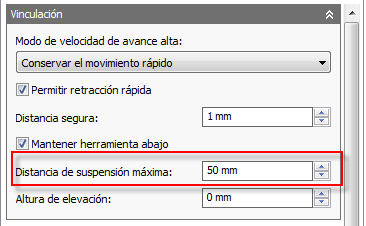 Inventor CAM permite controlar si desea mantener la herramienta abajo al definir la Distancia de suspensión máxima, lo que reduce el número de retracciones. Este parámetro se encuentra en la ficha Vinculación.